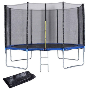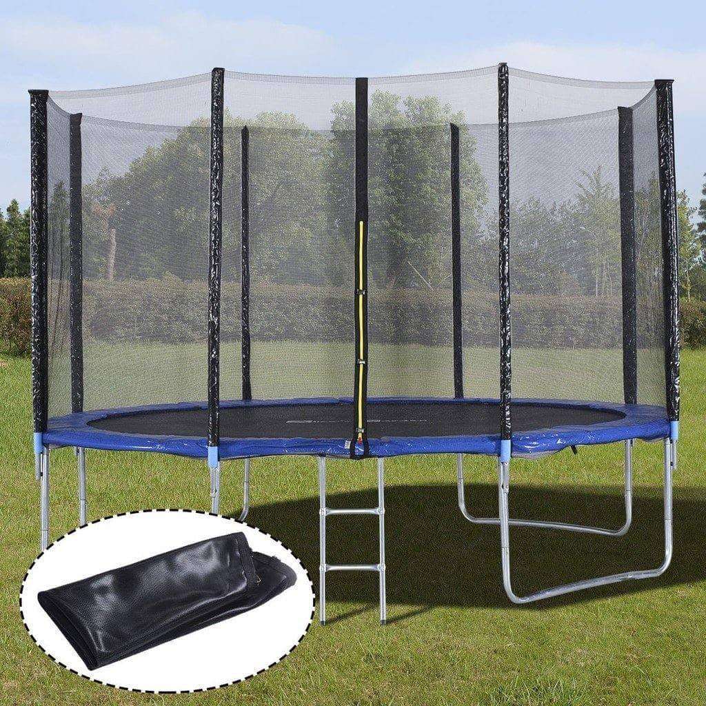 The trampolines are made with galvanized steel frame for durability and are rust resistant. The frame is supported by a 4-leg U-shape design and patented double steel plated welding at the joints for added stability to ensure safety. The heavy duty PP jumping mat is better stitched, giving you a better experience during playing. This net enclosure combo is designed for trampolines with no existing enclosure net, fits 12' trampoline with 4 u-shaped legs. It comes with everything you need to setup the enclosure and more, including a sturdy net, foam sleeves for pole frames, and all the hardware. The enclosure combo is designed to attach at each spring, eliminating gaps between the mat and net, so you're guaranteed not to fall off. And the foam padded frame poles provide additional protection for you from being injured. The net has dual closure entry with zipper and buckles so that you will never worry about being injured. The trampoline comes with a rain cover.