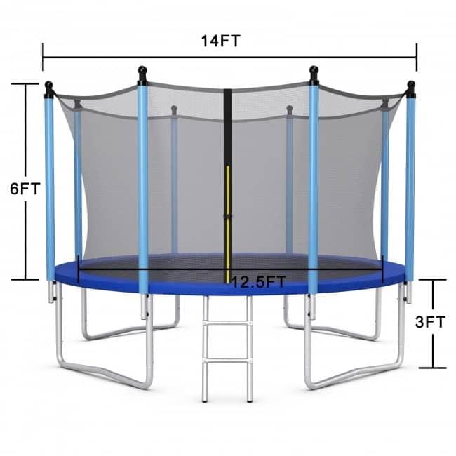 This 14 Feet Recreational Bounce Trampoline comes with heavy-duty steel pipes, protective foam sleeves, and U-shaped foot tubes providing strong strength and stability. What's more, the trampolines are rust-resistant and ultraviolet-resistant which allows you to enjoy outdoor jumping. And it is equipped with a high-resilient and wear-resistant jumping mat for providing excellent bounce, a tightly woven enclosure net to keep fingers and toes from getting caught, and long rust-resistant steel springs for safety. Other than that, the backyard trampoline comes with a ladder, dual zipper, and buckle-up closure system for kids to climb in and out easily. All in all, this trampoline is not only great for family activities to promote the relationship but also good for getting your blood pumping and your muscles moving, which will definitely be the best gift for your family!